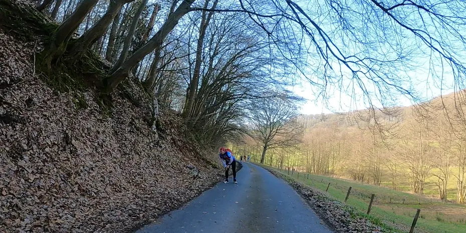 Auf dem endlosen Anstieg nach dem Ort Küchen passiert es: Bei Marcel läuft es gerade nicht rund. Akuter Salzmangel lässt unseren eisernen Race Director spüren, was mir letztes Jahr bei KM 43 passiert ist. Es krampft im Gebälk. Nun ja, das wird schon wieder. Die Baywatch-Crew kommt zur Aufmunterung auch zu uns hinzu. Für Abwechslung ist somit gesorgt.