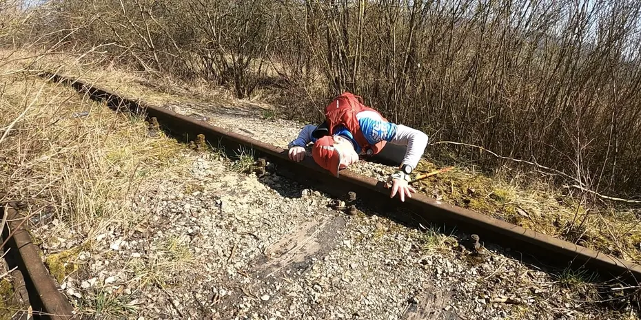 Apopos Angst: Beim Überqueren von Bahngleisen hat man stets Vorsicht walten zu lassen. Um den weiteren Läufern eine sichere Überquerung zu gewährleisten, horcht Marcel höchstpersönlich an den Gleisen, ob sich ein Zug nähert. Ein Race Director, wie er im Buche steht!