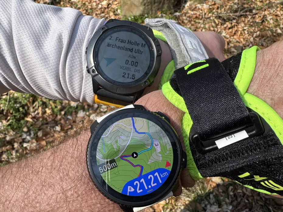 „Sind wir noch auf dem richtigen Track?“, fragt mich Tim. „Ja, hey. Das frag ich DICH!“, denke ich mir, schaue aber sicherheitshalber mal auf die Navigation der Uhr. Schwarze Schrift auf gelbem Grund – das bedeutet nichts Gutes. „ROUTENABWEICHUNG“ war nicht das, was ich lesen wollte. Ich zoome raus, von 100 m auf 200 m – keine ursprĂĽngliche Route. 500 m – immer noch nichts. 1000 m – ah, da ging es also mal rechts rein. Hätten wir das auch geklärt.